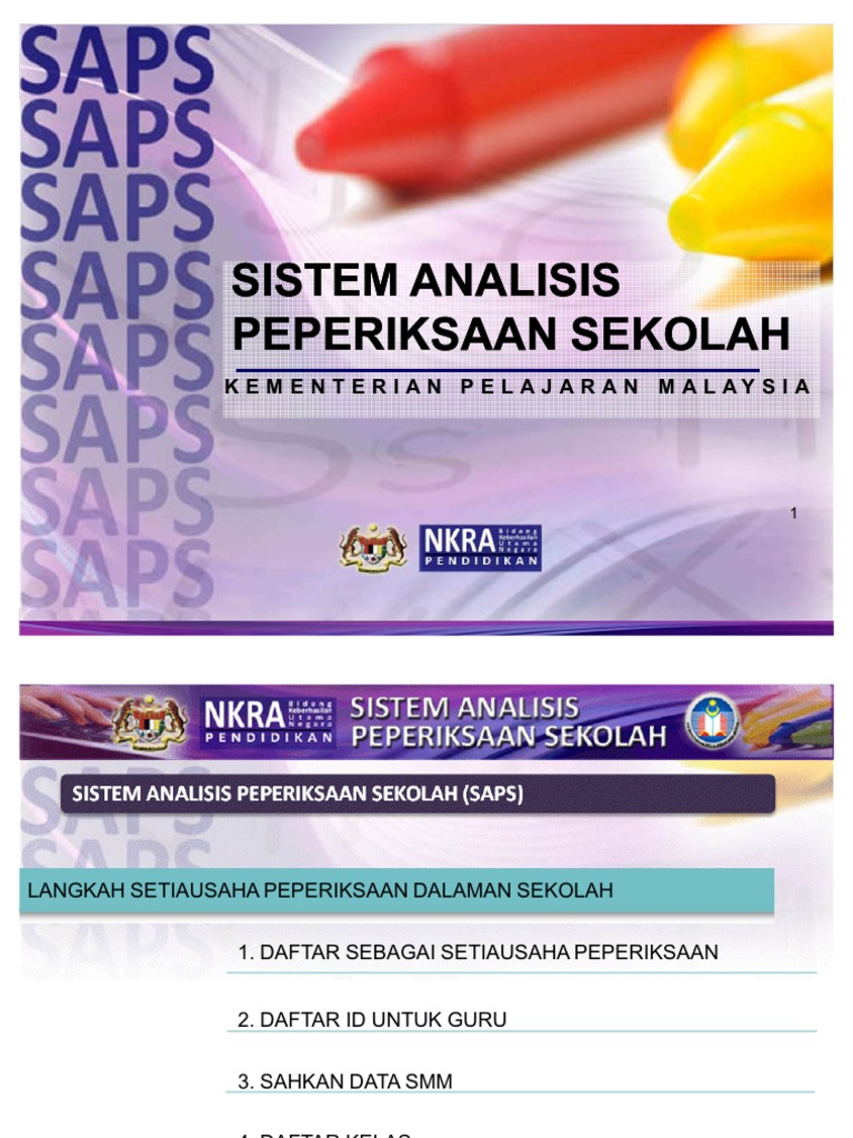 • saps merupakan sistem yang dibangunkan secara atas talian yang boleh dicapai oleh semua pihak termasuklah kpm, jpn, ppd dan sekolah. Saps dikenali sebagai sistem analisis peperiksaan sekolah yang diperkenalkan oleh kementerian pelajaran untuk menyelesaikan masalah pengendalian data. Secara mudahnya saps nkra merupakan pengkalan data maklumat peperiksaan untuk semua peperiksaan yang dijalankan di sekolah bantuan kerajaan kementerian pendidikan malaysia. Sistem analisis peperiksaan sekolah merupakan sistem yang dibangunkan secara atas talian yang boleh dicapai oleh semua pihak termasuk kpm, jpn, ppd dan sekolah. Saps merupakan singkatan bagi sistem analisis peperiksaan sekolah.